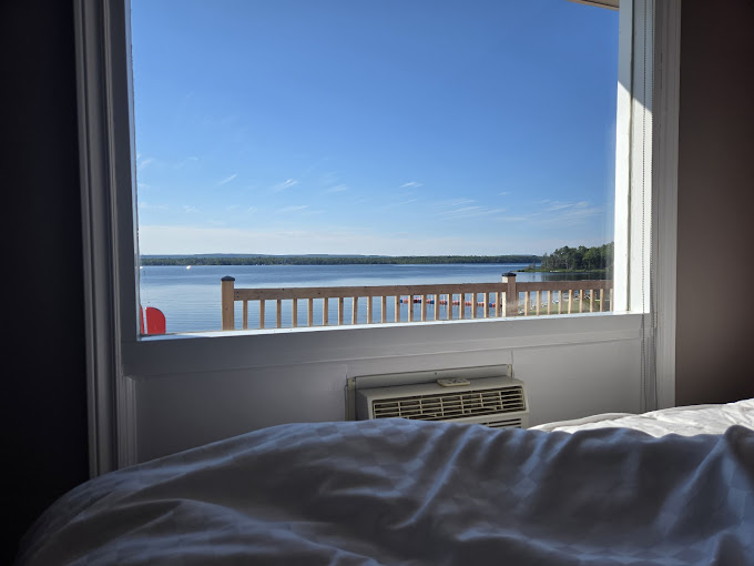 The extra money for the room with a view was worth it. The room had two doors. We parked in front of the front door and walked through to the back door to sit on the deck which ran the full length of the motel units. The view from our window and from the deck was beautiful. The room was clean and spacious, the bed was comfortable and the shower worked well. The hot breakfast was very good for a motel breakfast. There was a good restaurant a very short drive away where we ate dinner. The location was excellent for beginning or ending the Cabot Trail.